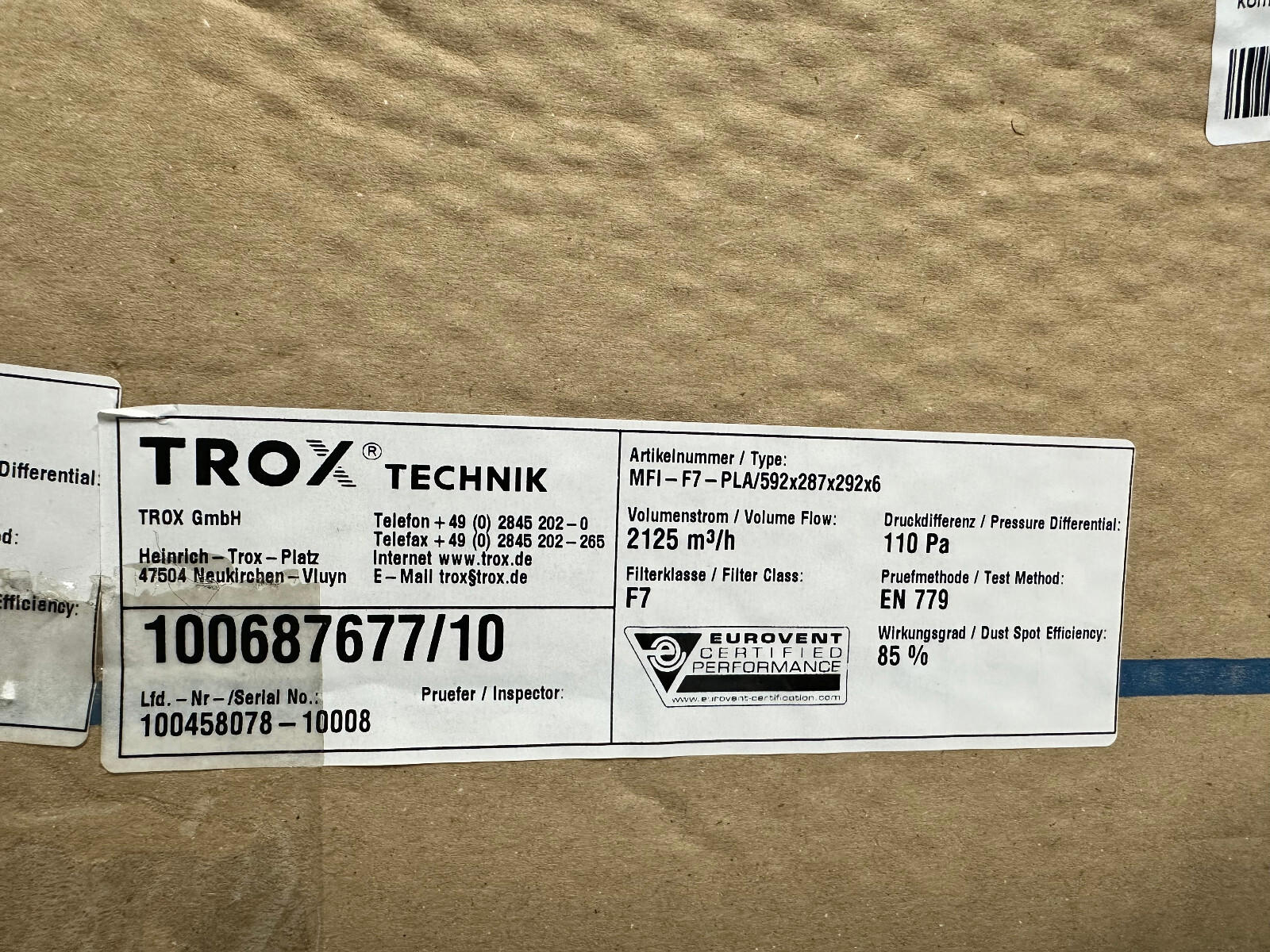 (2) Trox Technik MFI-F7-PLA / 592x287x292x6 Filter Cartridge Minipleat